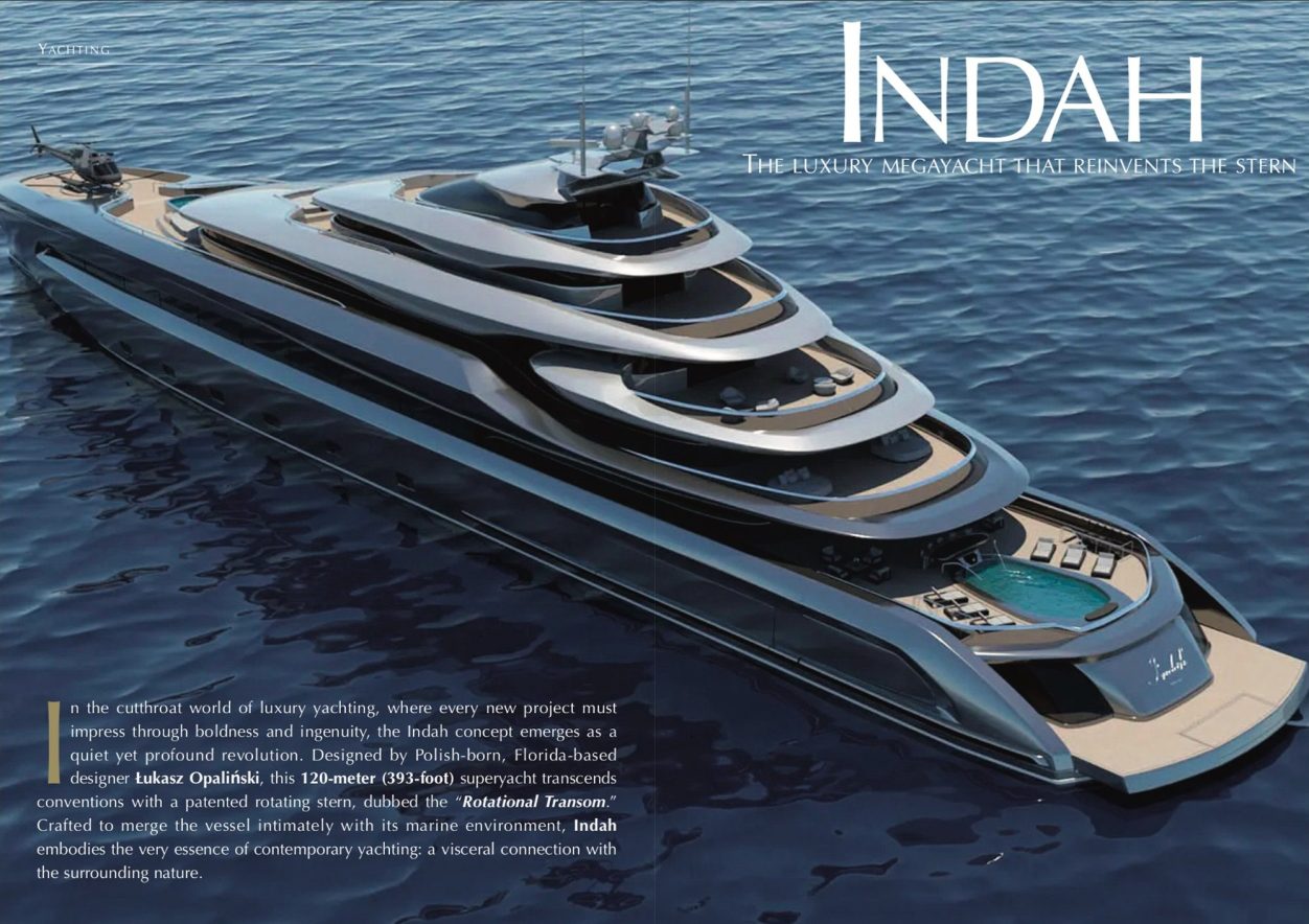 In the cutthroat world of luxury yachting, where every new project must impress through boldness and ingenuity, the Indah concept emerges as a quiet yet profound revolution. Designed by Polish-born, Florida-based designer Łukasz Opaliński, this 120-meter (393-foot) superyacht transcends conventions with a patented rotating stern, dubbed the “Rotational Transom.” Crafted to merge the vessel intimately with its marine environment, Indah embodies the very essence of contemporary yachting: a visceral connection with the surrounding nature...