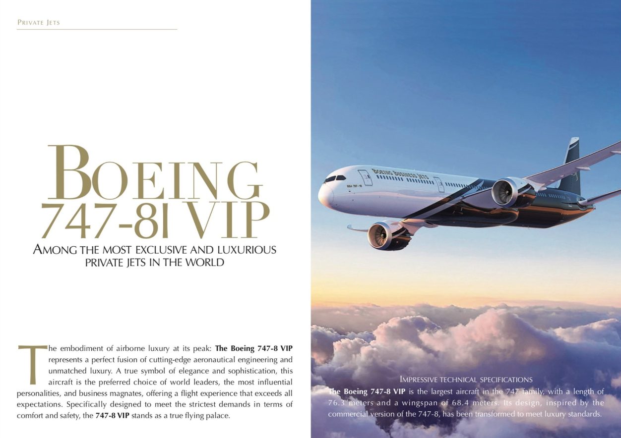 The embodiment of airborne luxury at its peak: The Boeing 747-8 VIP represents a perfect fusion of cutting-edge aeronautical engineering and unmatched luxury. A true symbol of elegance and sophistication, this aircraft is the preferred choice of world leaders, the most influential personalities, and business magnates, offering a flight experience that exceeds all expectations. Specifically designed to meet the strictest demands in terms of comfort and safety, the 747-8 VIP stands as a true flying palace...