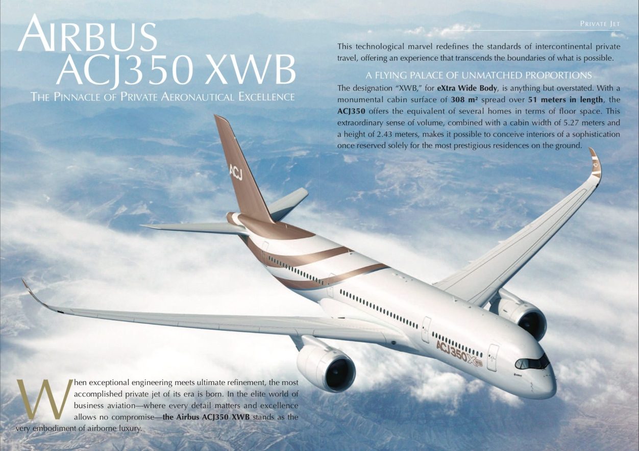 When exceptional engineering meets ultimate refinement, the most accomplished private jet of its era is born. In the elite world of business aviation—where every detail matters and excellence allows no compromise—the Airbus ACJ350 XWB stands as the very embodiment of airborne luxury. This technological marvel redefines the standards of intercontinental private travel, offering an experience that transcends the boundaries of what is possible. A Flying Palace of Unmatched Proportions The designation “XWB,” for eXtra Wide Body, is anything but overstated. With a monumental cabin surface of 308 m² spread over 51 meters in length, the ACJ350 offers the equivalent of several homes in terms of floor space. This extraordinary sense of volume, combined with a cabin width of 5.27 meters and a height of 2.43 meters, makes it possible to conceive interiors of a sophistication once reserved solely for the most prestigious residences on the ground. Wealthy owners can thus design true sky apartments within it, featuring private bedrooms with luxurious master suites, sumptuous lounges, conference rooms equipped with the latest technologies, relaxation areas, gourmet dining spaces, and even, for the most discerning, wellness facilities rivaling the finest spa resorts. The aircraft’s official capacity is 25 VIP passengers, although the most exclusive layouts often reduce this number to prioritize space and privacy. Range That Defies Geography It is in the realm of range that the ACJ350 demonstrates its absolute supremacy. In a standard configuration with 25 passengers, the aircraft boasts a range of 20,550 kilometers, or 11,100 nautical miles—equivalent to over 22 hours of uninterrupted flight. This technical feat radically transforms the very concept of intercontinental travel: London–Auckland, Beijing–Toronto, Buenos Aires–Jeddah become accessible without a single stop. Cruising at a speed of 1,098 km/h (Mach 0.85), the ACJ350 allows its occupants to cover the longest distances in absolute comfort, arriving at their destination refreshed and ready for their engagements—whether diplomatic, entrepreneurial, or purely indulgent. A Technological Marvel Serving Refinement The aircraft is powered by two Rolls-Royce Trent XWB-97 turbofan engines, among the most efficient and high-performing in their class. These next-generation engines enable the ACJ350 to sustain a maximum cruising altitude of 13,100 meters, placing it above turbulence and the majority of commercial air traffic. A Revolutionary Cabin Environment The ACJ350 redefines in-flight atmospheric quality. Cabin altitude is maintained at only 6,000 feet (1,800 meters), and the air is fully refreshed every 2 to 3 minutes. This advanced environmental management, combined with increased humidity and optimal pressurization, significantly reduces jet lag and ensures passengers arrive in peak physical and mental condition. Noise levels are another major advantage. Thanks to exceptional sound insulation and some of the quietest engines in the industry, the ACJ350 offers what Airbus engineers call the “Harmony Cabin”, located in the quietest section of the aircraft. This absolute tranquility allows occupants to work, relax, or socialize without being disturbed by the usual sounds of aviation. Modular LED lighting, capable of simulating natural day and night cycles, panoramic windows offering breathtaking vistas, and state-of-the-art entertainment technologies complete a meticulously designed environment crafted to meet the demands of the most sophisticated clientele. Limitless Personalization One of the ACJ350’s decisive advantages lies in its Easyfit system, a technological innovation that greatly simplifies bespoke cabin customization. This system, composed of hundreds of pre-installed attachment points and standardized interfaces distributed throughout the carbon-fiber fuselage, drastically eases the installation of partitions, furniture, and equipment without the need to drill into the aircraft’s complex structure. This flexibility allows clients to collaborate closely with the world’s top interior designers and artisans to create truly unique spaces. Hand-stitched leather finishes, exotic wood veneers, custom carpets, onboard artworks, and next-generation secure communication systems—no whim is beyond reach. Configurations can include bedrooms with king-size beds, bathrooms equipped with rain-effect showers, professional kitchens enabling Michelin-star chefs to prepare gourmet meals at altitude, offices with high-definition video conferencing facilities, and even dedicated fitness or wellness areas featuring gym equipment and spa installations. Excellence Comes at a Price Acquiring an Airbus ACJ350 represents an investment of between $300 million and $375 million, depending on the level of customization desired. To this amount must be added interior outfitting costs, which can easily reach several tens of millions of dollars for the most elaborate configurations. For example, the three ACJ350s ordered by the German government required a total investment of €1.2 billion, covering the acquisition of the aircraft, VIP outfitting, and integration of military defense systems. For those who prefer leasing, chartering an ACJ350 costs between $30,000 and $40,000 per hour. Hourly operational expenses—including fuel, crew salaries, insurance, and other running costs—range between $15,000 and $20,000. These figures, while substantial, must be considered in light of the aircraft’s unique capabilities. The ACJ350 is not merely a means of transport; it is a strategic tool that allows its owner to connect any point on the globe non-stop, in a fully controlled environment, ensuring productivity, confidentiality, and absolute comfort. The Future of Prestige Private Travel In a world where time is the most precious resource for the global elite, and where health security and confidentiality have become absolute imperatives, the Airb