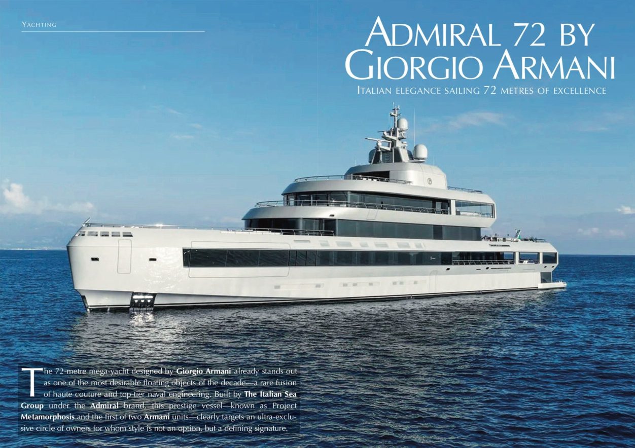 The 72-metre mega-yacht designed by Giorgio Armani already stands out as one of the most desirable floating objects of the decade—a rare fusion of haute couture and top-tier naval engineering. Built by The Italian Sea Group under the Admiral brand, this prestige vessel—known as Project Metamorphosis and the first of two Armani units—clearly targets an ultra-exclusive circle of owners for whom style is not an option, but a defining signature. Dimensions, architecture and price Measuring 72 metres in length with a beam of approximately 12.2 metres and a volume of around 1,800 to 2,000 GT, this mega-yacht positions itself at the summit of the contemporary Mediterranean fleet while retaining deliberately clean, restrained proportions. Its ice-class steel hull and aluminium superstructure express a clear transoceanic vocation, perfectly suited to long-range cruising in all seasons. From a financial standpoint, the project was offered at around €105 million for the first unit, a figure the shipyard estimates at close to €155 million in replacement value in its most advanced configuration. At this level of investment, the buyer gains not only an exceptional floating palace, but also Giorgio Armani’s latest creative expression in the world of yachting—giving the yacht an almost collectible dimension. Performance and technical capabilities Powered by a pair of MTU 16V 4000 M63 engines, the 72-metre Armani reaches a top speed of approximately 15 knots, while offering a range of more than 6,000 nautical miles at an economical cruising speed of around 11 knots. This blend of restrained power and long-range capability makes Mediterranean–Caribbean crossings entirely feasible, without compromising comfort or acoustic discretion. The yacht is equipped with a full suite of state-of-the-art stabilisation systems, a Dynamic Positioning System for delicate anchoring operations, and a helicopter platform integrated into the upper deck, enabling fully independent private air operations. Technical garages house a fleet of large tenders and water toys, accessed directly from the main deck to ensure seamless logistics without disturbing the tranquillity of guest areas. The interior layout has been conceived like that of a private mansion at sea, accommodating around 14 guests in seven suites, served by a crew of approximately twenty professionals. The standout feature is a truly private owner’s deck of nearly 180 m², comprising a full-beam master suite, a lounge, and a bar-dining area opening onto a vast terrace with a counter-current swimming pool and shaded relaxation zones. Six guest suites, all located on the main deck, benefit from the yacht’s generous beam and meticulous sound insulation, ensuring a level of privacy comparable to the finest hotel suites in the world. Communal spaces unfold into double-aspect panoramic lounges, formal reception salons, dining rooms that can be partitioned with movable panels, and a spectacular beach club connected to a full spa (sauna, hammam, gym) and expansive terraces at water level. The Giorgio Armani signature and Armani/Casa It is in the aesthetic treatment that the 72-metre yacht fully reveals Giorgio Armani’s signature, with the designer overseeing both the exterior lines and the entire interior décor through Armani/Casa. The silhouette—defined by taut geometric volumes softened by subtle curves—is distinguished by a satin finish and a long ribbon of full-height glazing that plays with light like contemporary seafront architecture. Inside, the vocabulary is one of sensual modernism: palettes of earthy tones, beiges and smoky greys, punctuated by subtle golden accents; precious materials such as polished marble, dark woods and refined textiles; and carefully calibrated indirect lighting. Spaces seem to float thanks to airy curtains and movable partitions that divide without enclosing, creating visual continuity conducive to both contemplation and intimacy. Décor, atmospheres and lifestyle The décor follows the pure Armani tradition: an understated ostentation, where each piece of furniture—often drawn from Armani/Casa collections—becomes a discreet design object rather than a flamboyant statement. Vast lounges feature generous compositions of linear sofas adorned with cushions in harmonious powdery tones, equally suited to formal receptions or more relaxed evenings over cocktails. Dining areas, whether indoors or on the exterior decks, favour intimate atmospheres, with a play of indirect lighting and accent lamps designed to flatter silhouettes and materials, much like in a Milanese apartment. On deck, L-shaped lounge areas, daybeds and bespoke outdoor furniture extend this aesthetic of quiet luxury, offering the owner an ideal stage for highly curated receptions, from Monaco to Porto Cervo. A manifesto for a discreet elite Beyond its technical specifications alone, the 72-metre Giorgio Armani mega-yacht emerges as a manifesto for cultivated luxury, reserved for an elite that values nuance over ostentation. In a world of large-yacht design often dominated by excess volume and visual bravado, this vessel proposes an alternative path: one of almost silent architectural elegance, where every detail—from the cushions to the hull lines—is conceived as part of a coherent aesthetic narrative.