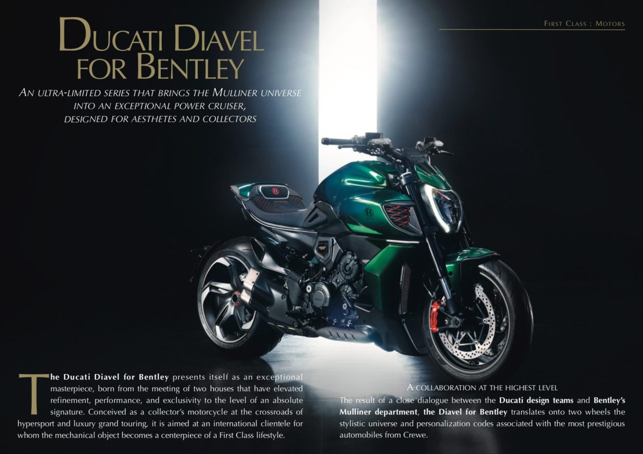 The Ducati Diavel for Bentley presents itself as an exceptional masterpiece, born from the meeting of two houses that have elevated refinement, performance, and exclusivity to the level of an absolute signature. Conceived as a collector’s motorcycle at the crossroads of hypersport and luxury grand touring, it is aimed at an international clientele for whom the mechanical object becomes a centerpiece of a First Class lifestyle...