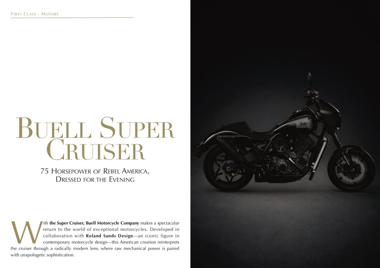 With the Super Cruiser, Buell Motorcycle Company makes a spectacular return to the world of exceptional motorcycles. Developed in collaboration with Roland Sands Design—an iconic figure in contemporary motorcycle design—this American creation reinterprets the cruiser through a radically modern lens, where raw mechanical power is paired with unapologetic sophistication. The Super Cruiser is not aimed at the general public. It targets a highly selective clientele: discerning collectors, performance connoisseurs, and enthusiasts of rare mechanical objects, for whom a motorcycle is above all a personal statement—on par with a high-end watch or a grand touring automobile. An Iconic Silhouette, Bridging Heritage and Modernity Measuring approximately 2.40 meters in length with a seat height of 826 mm, the Super Cruiser commands a low, taut stance, inspired by the legendary 1980s Harley FXR models while breaking free through a decidedly contemporary design. The eye is immediately drawn to its streamlined nose, minimalist round LED headlight, and shortened rear fender, which reveals a massive Dunlop Sportmax Q5A rear tire. The ultra-light tubular trellis frame—both an aesthetic and technical backbone—keeps the weight to just 220 kg (in running order), a remarkable figure in the world of high-displacement cruisers. This structural approach gives the bike a power-to-weight ratio akin to a superbike, while maintaining a sleek, commanding presence. The ergonomics are meticulously engineered, blending mid-mounted footpegs, a modestly sized handlebar, and a raised one-piece seat that provides premium lumbar support. The rider’s posture is upright, engaged, and ready to unleash the beast. Blacked-out finishes paired with precisely machined components position the Super Cruiser in the luxury custom realm—designed as much to be admired as to be ridden. Exceptional Mechanics, Without Compromise At the heart of the machine beats a liquid-cooled 1,190 cc V-twin, derived from the Hammerhead engine and optimized here for ultra-performance cruiser use. The numbers speak for themselves: 175 horsepower at 10,000 rpm and 127 Nm of torque at 8,500 rpm. Paired with a six-speed gearbox and an anti-hopping hydraulic clutch, this engine rockets the Super Cruiser from 0 to 100 km/h in under 3 seconds, with a top speed approaching 240 km/h—performance levels usually reserved for Europe’s most exclusive sportbikes. True to Buell’s DNA, the aluminum perimeter frame—also serving as the fuel tank—lowers the center of gravity and contributes to exceptional agility. Seventeen-inch wheels shod with sport tires, combined with geometry that allows up to 50 degrees of lean, enable this cruiser to confidently rival benchmarks like the Ducati Diavel on twisty roads. Chassis, Suspension, and Braking: Top-Tier Performance The Super Cruiser’s chassis is equally impressive. It features a Fox inverted front fork and a Fox rear mono-shock, delivering road feedback with near-surgical precision—even at a spirited pace. Braking duties are entrusted to Brembo, with an impressive 386 mm front disc clamped by 8-piston radial calipers, complemented by ABS and adjustable traction control. All functions are managed through modern electronics featuring a TFT dashboard and ride modes, elevating the user experience to the level of today’s best superbikes. Exclusivity, Price, and Heritage Vision Priced at $25,900 USD (around €24,500, excluding taxes and options), production is manual and limited, carried out in Grand Rapids, Wisconsin—reinforcing its status as a rare collectible. Buell Performance Parts offers numerous customization options— specific exhausts, optimized suspension, carbon components, or elegant luggage—which can raise the price to around $30,000, a level comfortably embraced by a clientele accustomed to high-emotion, potentially heritage-worthy objects. An American Lifestyle Vision, First Class Style The Buell Super Cruiser is a statement: of refined mechanical America, liberated from clichés, capable of producing objects that are both radical and elegant. It is equally at home roaring along the Pacific Coast Highway or making a striking entrance at Pebble Beach, alongside classic cars and exceptional timepieces. Designed for those who collect to feel, not just to display, the Super Cruiser embodies a form of contemporary luxury: discreet, powerful, and authentic.
