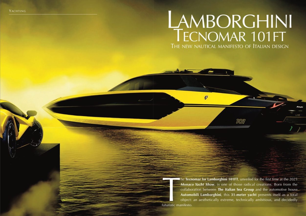 The Tecnomar for Lamborghini 101FT, unveiled for the first time at the 2025 Monaco Yacht Show, is one of those radical creations. Born from the collaboration between The Italian Sea Group and the automotive house Automobili Lamborghini, this 31-meter yacht presents itself as a total object: an aesthetically extreme, technically ambitious, and decidedly futuristic manifesto.