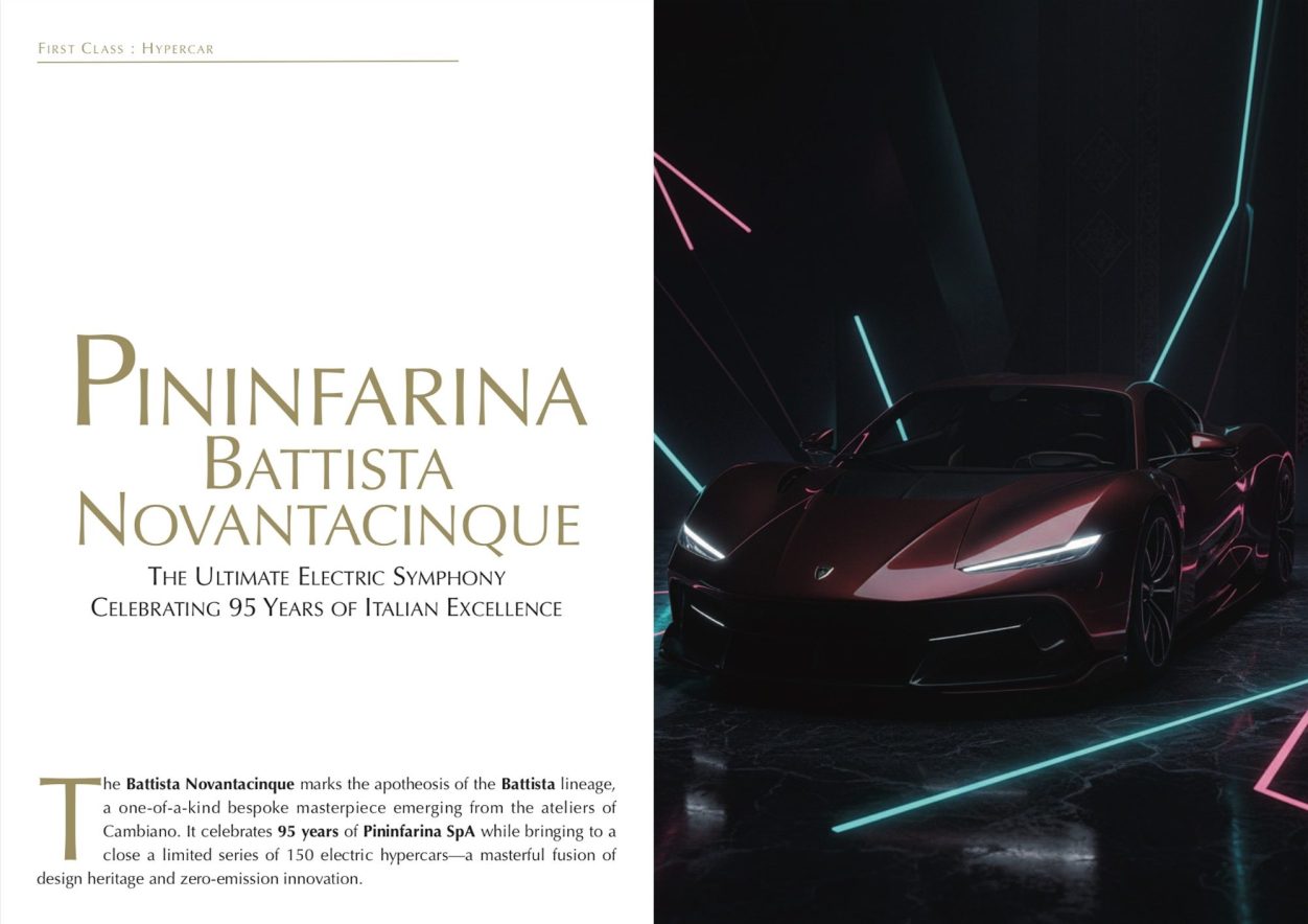 The Battista Novantacinque marks the apotheosis of the Battista lineage, a one-of-a-kind bespoke masterpiece emerging from the ateliers of Cambiano. It celebrates 95 years of Pininfarina SpA while bringing to a close a limited series of 150 electric hypercars—a masterful fusion of design heritage and zero-emission innovation. Pininfarina Heritage: From Analog Glory to the Electric Era Founded in 1930 by Battista “Pinin” Farina, the Turin-based coachbuilder penned icons such as the Ferrari 250 GT California, the Alfa Romeo Spider, and the Lancia Flaminia, forging a legacy of timeless elegance. Automobili Pininfarina—its automotive arm relaunched in 2018—propels this DNA into the electric age with the Battista, the most powerful hyper-GT ever conceived in Italy. The Novantacinque elevates this legacy as an ultimate artisanal statement, bridging a century of iconic lines with futuristic propulsion. Design: Scarlet Carbon and Bespoke Refinement Its Exposed Signature Carbon Tinted Rosso Gloss livery reveals a deep red carbon weave, a tribute to Italy’s racing roots, accented by PURA Vision Gold and Nero Torino details. The rear wing bears the Novantacinque script, while polished Iconico wheels and the Furiosa Pack’s gold pinstripe add a discreet shimmer. Inside, Pilota seats in black leather and Alcantara, machined aluminum rotary controls, and a gold-embroidered “95” logo on the knee pads create a tactile, jewel-like cocoon—standing firm against the onslaught of touchscreens. Performance: An Electric Hypercar of Absolute Records Four electric motors—one per wheel—unleash 1,900 hp and 2,340 Nm of torque, with all-wheel drive and advanced torque vectoring. Acceleration from 0–62 mph takes under 2 seconds, eclipsing current Formula 1 cars; 0–186 mph is achieved in under 12 seconds, with a top speed exceeding 217 mph. A 120 kWh battery delivers up to 476 km of WLTP range (300 miles EPA), complemented by five configurable driving modes—instant, silent, and impeccably controlled power. One-of-a-Kind in the World, the Last Bespoke Example Before Production Ends It transcends the other 149 Battista models. Base series price: around €2.2 million (USD 2.5 M), with customizations pushing it up to USD 3 M for the most discerning buyers. Designed for a wealthy collector, it embodies absolute luxury: bespoke, numbered, and historic. The Pininfarina Battista Novantacinque stands out with a series of exclusive aesthetic and interior elements absent from the 149 other Battista models. These commemorative touches pay tribute to 95 years of Pininfarina SpA, cementing its status as the ultimate bespoke piece before production concludes at the end of 2026. Exterior Exclusives Exposed Signature Carbon Tinted Rosso Gloss finish: visible carbon bodywork tinted deep red, symbolizing Italian passion, speed, and emotion—unique to the Novantacinque, never seen on standard Battista models. Bespoke livery with PURA Vision Gold Paint Gloss, Nero Torino Gloss accents, and the Furiosa Pack’s distinctive gold pinstripe; “Novantacinque” engraved on the rear wing. Iconico Precision Polished Colourless wheels with Black Channel Matt details, black calipers, and brushed anodized aluminum accents for enhanced contrast. Interior Exclusives Knee pads in black Alcantara embroidered with the gold “95” logo—a signature commemorative element. Chassis plates and door sills with a unique design, customized for this edition. Newly designed machined aluminum rotary controls, anodized gold/black; bicolor black/gold stitching on Pilota leather/Alcantara seats; satin Exposed Signature carbon inserts. Global One-of-a-Kind Status These details make the Novantacinque a singular commission—the “crescendo” of Battista production—positioned as a future iconic collector’s car, unmatched within the lineup. The Novantacinque is not a melancholy finale, but a manifesto: Pininfarina combines centuries of artisanal know-how with radical electrification, laying the foundations for ultra-high-end sustainable mobility. For connoisseurs of the extraordinary, it redefines the hypercar as a living work of art, where performance and prestige intertwine. First Class Magazine International celebrates this masterpiece, a symbol of visionary Italy. Technical Specifications Powertrain Type: 100% electric, 4 motors (1 per wheel), torque-vectoring AWD Combined power: 1,900 hp (1,400 kW) Combined torque: 1,730 lb-ft (2,340 Nm) Battery: 120 kWh high-density lithium-ion Range: Up to 295 miles (WLTP 476 km) AC/DC Charging: Up to 300 kW (80% in 25 minutes) Dynamic Performance 0–62 mph: < 2 s – 0–124 mph: < 5 s – 0–186 mph: < 12 s Top speed: > 217 mph (350 km/h)
