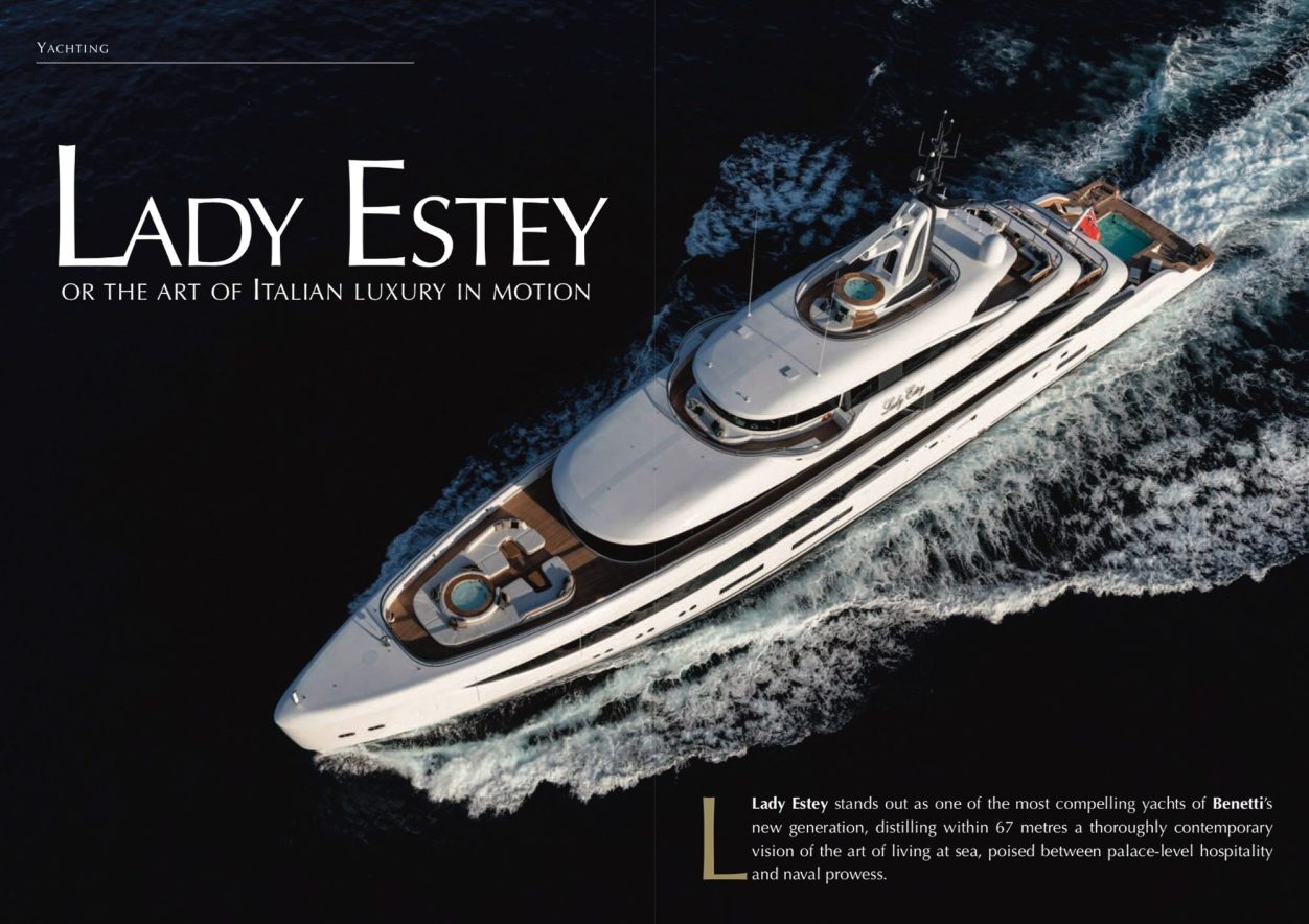 Lady Estey stands out as one of the most compelling yachts of Benetti’s new generation, distilling within 67 metres a thoroughly contemporary vision of the art of living at sea, poised between palace-level hospitality and naval prowess. Built for a particularly discerning owner, she embodies what First Class Magazine International readily describes as ultra-yachting: a rare fusion of refinement, technology, and an exceptionally high degree of customization. A floating palace by Benetti Lady Estey belongs to the B.Now 67M Oasis Deck series, the Italian shipbuilder Benetti’s flagship line in the superyacht segment over 60 metres. Measuring 67 metres in length with an 11-metre beam and a volume of approximately 1,330 to 1,340 GT, she features a steel hull topped by an aluminium superstructure, in full compliance with Lloyd’s Register standards. Designed externally by the British studio RWD, the yacht embraces the Oasis Deck concept, featuring an open stern facing the sea that dissolves the boundary between air-conditioned interiors and sun-drenched terraces. Flying the Cayman Islands flag, Lady Estey subtly underscores her place within the international sphere of great private yachts, frequently cruising the Mediterranean between Antibes, Monaco, and Porto Cervo. The interior design, entrusted to Sinot Yacht Architecture & Design, breaks away from the pared-back minimalism of recent years to assert a more dramatic, darker, and highly sophisticated aesthetic. The use of precious woods—sycamore, ebony, wenge, ziricote, and macassar—combines with veined marbles, metallic inlays, and recurring wall panelling used as a leitmotif, creating an almost theatrical, scenographic setting. Lady Estey accommodates up to 14 guests across 7 cabins, served by a crew of around 17, enabling a level of service comparable to that of a superior five-star hotel. A spectacular glass elevator and a grand marble staircase with glass balustrades form the heart of the vessel, acting as a true backbone connecting the various decks. The Owner’s Deck: a manifesto of privacy The upper deck is entirely dedicated to the owner, configured like an apartment suspended above the sea. At the bow, a full-beam suite with extensive glazing offers panoramic views, complemented by a private office, dressing room, and bathroom designed with a distinctly residential feel. At the stern, a private lounge extends onto an outdoor dining terrace, allowing seamless transitions from a confidential meeting to a dinner under the stars. The observation deck, discreetly tucked above, houses a spa pool facing the horizon—a private retreat for the owner when the yacht anchors in a secluded cove. The Oasis Deck concept and wellness areas At the aft of the main deck, the Oasis Deck concept unfolds a wide open beach, lowered close to the waterline, centered around a glass-edged infinity pool. The bulwarks open to create a true terrace on the sea, multiplying spaces for sunbathing, lounging, and entertaining. The yacht features three distinct pools: the large aft infinity pool, a mirror pool at the bow of the owner’s deck enhanced with a cascading effect, and the more intimate spa pool on the observation deck. On the lower deck, a fully equipped wellness center combines a gym, sauna, hammam, and treatment room, affirming Lady Estey’s identity as a true floating resort. Technical specifications and performance From a technical standpoint, Lady Estey is built on a steel displacement hull with an aluminium superstructure, optimized for long-range cruising comfort. She is powered by a pair of Caterpillar 3512E DITA engines, each developing 1,810 horsepower, enabling a maximum speed of 16 knots. Her comfortable cruising speed is around 12 knots, with a range of approximately 5,000 nautical miles thanks to fuel tanks holding some 110,000 litres—enough for a nonstop transatlantic crossing. These characteristics place Lady Estey squarely in the 60–70 metre superyacht category, capable of combining Mediterranean cruises, Caribbean seasons, and extended ocean crossings. Order of magnitude: acquisition price Lady Estey, identified as B.Now 67M under reference FB287, was offered at around €80 million within the large-yacht market before being reported sold. This valuation aligns with the typical range for semi-custom yachts of 50–70 metres, which average around €24 million, with particularly luxurious configurations commanding significantly higher prices. Considering her volume exceeding 1,300 GT, full owner’s deck, wellness facilities, and high degree of interior customization, Lady Estey clearly sits at the top end of this segment, in the €70–80 million range for a new yacht of comparable specification. On the secondary market, such a vessel could retain particularly strong residual value, supported by the shipyard’s reputation and the model’s rarity. Annual operating and maintenance costs For a yacht of this calibre, professionals generally estimate an annual operating budget of around 10–15% of the vessel’s value. For Lady Estey, valued at approximately €80 million, this translates to operating costs in the range of €8–12 million per year, covering crew, fuel, maintenance, insurance, and port fees. Industry studies indicate that a 60-metre yacht already requires €2–3.5 million annually for upkeep and routine expenses, excluding major refits—a figure that naturally increases for a larger 67-metre vessel. Fuel costs, depending on the cruising program, can reach €400,000 to €1 million per year for a large transoceanic yacht, while annual berths at the most sought-after marinas—Monaco, Porto Cervo, Ibiza—easily exceed half a million euros for a yacht of this size. A manifesto for contemporary ultra-yachting Beyond its technical prowess, Lady Estey exemplifies the evolution of superyachting toward yachts designed as itinerant private residences, combining privacy, theatrical interior design, and an abund