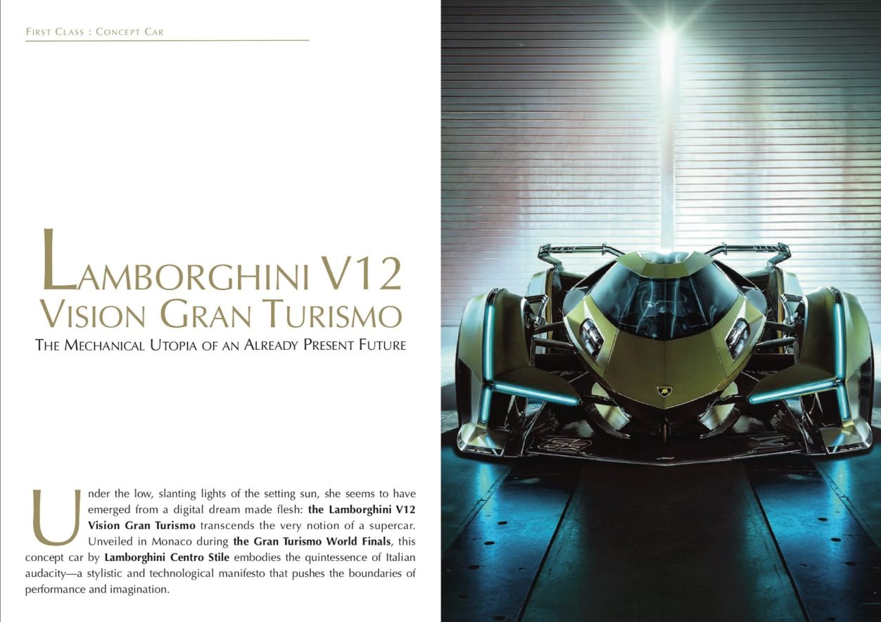 Under the low, slanting lights of the setting sun, she seems to have emerged from a digital dream made flesh: the Lamborghini V12 Vision Gran Turismo transcends the very notion of a supercar. Unveiled in Monaco during the Gran Turismo World Finals, this concept car by Lamborghini Centro Stile embodies the quintessence of Italian audacity—a stylistic and technological manifesto that pushes the boundaries of performance and imagination. A Concept Born from the Virtual Originally commissioned by Polyphony Digital, the studio behind the legendary video game, the V12 Vision Gran Turismo was conceived as a car made for the digital world before being brought to life in reality. Lamborghini seized the opportunity to express its vision of the automotive future—a world where mechanical emotion meets aerodynamic perfection. Line by line, its design evokes stealth fighters: a centrally isolated cockpit, sharp aerodynamic appendages, and a distinctive Y-shaped light signature. Every surface reflects the pursuit of optimal airflow, every angle seemingly sculpted by the wind. The extensive use of carbon fiber—a material now inseparable from the brand—ensures a lightweight structure, enhanced by a monocoque architecture of extreme rigidity. The Soul of a Sacred Bull Beneath its spectacular body lies the legendary 6.5-liter naturally aspirated V12, derived from the Aventador SVJ. This engine, a true masterpiece of mechanical craftsmanship, produces over 770 horsepower, delivered to all four wheels through a seven-speed sequential gearbox. A mechanical symphony whose raw and captivating tones pay homage to the purest traditions of Sant’Agata Bolognese. Lamborghini claims here more than mere power: a dialogue between the real and the virtual. The car serves as a bridge between the video game universe and the tangible passion of drivers. Inside the cockpit, the heads-up display projects directly onto the windshield, enveloping the driver in a bubble of data and light, reminiscent of fighter jet cockpit interfaces. The Poetry of Automotive Futurism The V12 Vision Gran Turismo will likely never see a production lineage, and that is precisely what makes it remarkable. Designed to evoke what the brand could be in 2040, it acts as an aesthetic and ideological laboratory: a manifesto of emotional engineering. Lamborghini explores a fundamental idea here—that high performance does not exclude beauty, and that technology can become an art form in its own right. A symbol of an uncompromising future, the V12 Vision Gran Turismo embodies controlled extravagance, the virtuosity of Italian design fused with digital precision. In a world increasingly driven by rationality, it stands as a cry of passion: the voice of a house that, for over half a century, has cultivated extravagance as a virtue. Technical Specifications: Lamborghini V12 Vision Gran Turismo Type: Virtual hypercar concept, single-seater, Vision Gran Turismo project Design: Lamborghini Centro Stile, Sant’Agata Bolognese Powertrain Architecture: Hybrid V12, derived from the Lamborghini Sián FKP 37 Internal Combustion Engine: 6.5-liter naturally aspirated V12, mid-rear mounted Combined Power: Up to 819 hp thanks to a supercapacitor hybrid system Transmission: Sequential gearbox, permanent all-wheel drive (configuration as in Gran Turismo virtual version) Chassis, Dimensions & Structure Configuration: Single-seater with central cockpit, front-entry layout inspired by fighter jets Materials: Extensive use of carbon fiber and active aerodynamic surfaces (concept) Aerodynamics Massive rear wing integrating a Y-shaped light signature Main body “detached” from the wings to optimize airflow Stylistic Signature Lights: Front and rear Y-shaped light signature, emblematic Lamborghini motif Hexagonal Theme: Wheels and side glazing inspired by the Lamborghini Marzal Exhaust: Multiple rear outlets, highlighting the extreme character of the concept Interface & Digital Universe Unique driving position, futuristic steering wheel integrating primary controls Driving information projected virtually in front of the driver Video Game Integration: Part of the Gran Turismo universe on PlayStation, available as a Vision Gran Turismo car.