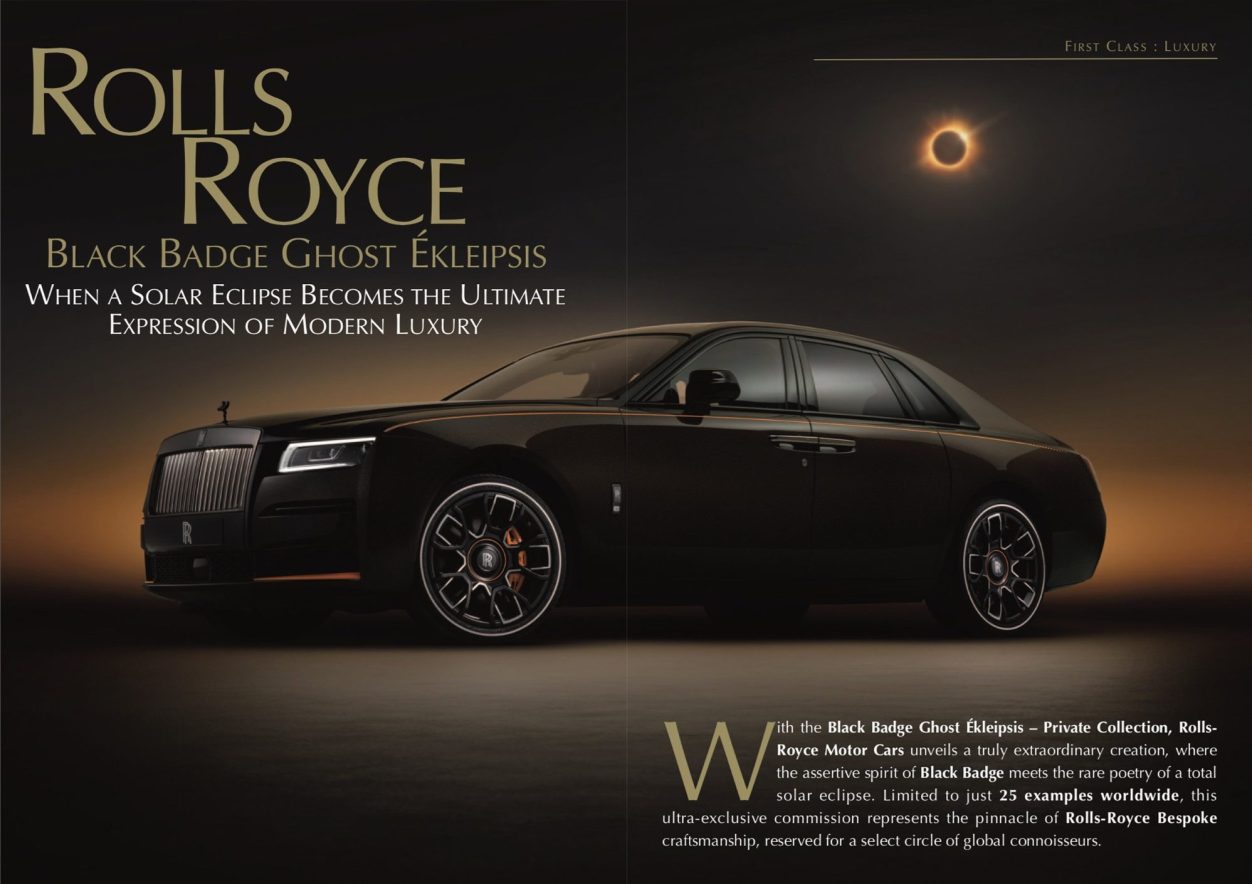 With the Black Badge Ghost Ékleipsis – Private Collection, Rolls-Royce Motor Cars unveils a truly extraordinary creation, where the assertive spirit of Black Badge meets the rare poetry of a total solar eclipse. Limited to just 25 examples worldwide, this ultra-exclusive commission represents the pinnacle of Rolls-Royce Bespoke craftsmanship, reserved for a select circle of global connoisseurs. Inspired by one of nature’s most captivating celestial phenomena, Ékleipsis explores the dramatic interplay between light and darkness, translating a fleeting cosmic alignment into a timeless automotive masterpiece. A Cosmic Performance from the Moment You Enter The experience begins with a moment of theatre. The fully Bespoke Animated Starlight Headliner comes to life as the doors close and the engine starts. The stars gradually dim before a mesmerising sequence unfolds, recreating the totality of a solar eclipse. A halo of 940 illuminated stars represents the Sun’s radiant corona, surrounded by 192 additional stars, evoking the rare spectacle of stars visible in the daytime sky. The animation lasts exactly seven minutes and thirty-one seconds — the longest possible duration of a total solar eclipse — a level of precision that reflects Rolls-Royce’s obsession with detail. An Illuminated Fascia as a Celestial Work of Art The illuminated fascia becomes a cosmic tableau, composed of 1,846 laser-etched stars, each individually positioned by a single Bespoke designer after more than one hundred hours of meticulous craftsmanship. At its centre lies a defining statement: a Bespoke timepiece set with a 0.5-carat brilliant-cut diamond, referencing the iconic “Diamond Ring” effect observed during a solar eclipse. This marks the first time in Rolls-Royce history that a gemstone has been integrated into a clock bezel — a bold and symbolic innovation. The ‘Panoramic Sunset’ Interior During the moment of totality, a golden twilight envelops the horizon, creating the illusion of a 360-degree sunset. Rolls-Royce captures this rare phenomenon through the Panoramic Sunset interior, featuring bi-coloured leather seats with a unique perforated artwork formed by more than 200,000 individual perforations. Mandarin leather, tinted and then perforated, subtly reveals a lighter tone beneath the surface, producing extraordinary depth and visual movement. The pattern results from a fusion of computational design and hand refinement, perfected through multiple iterations. An Exterior Defined by Golden Darkness The exterior finish, Lyrical Copper, embodies the mysterious light cast during an eclipse. Infused with powdered copper pigment, the surface appears dark and restrained until it catches the light, revealing a rich, dramatic iridescence. Mandarin accents on the brake calipers, beneath the Pantheon Grille and along the hand-painted coachline recall the intense pulses of sunlight as the eclipse unfolds. The coachline itself features a subtle abstract motif symbolising the transition from light to darkness. A Private Collection for the Few Every detail of the Rolls-Royce Black Badge Ghost Ékleipsis has been conceived as an emotional and sensory experience, where advanced engineering serves art, storytelling and emotion. Offered at an estimated starting price of approximately €500,000 before taxes, depending on the level of Bespoke personalisation, this Private Collection is reserved for collectors who view the motor car not merely as a luxury object, but as a celestial work of art designed to endure. With Ékleipsis, Rolls-Royce does more than create an automobile — it captures a rare and ephemeral cosmic event, transforming it into a permanent expression of modern luxury at its most extraordinary.